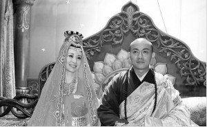 昨日拍摄的主要是唐僧在女儿国的戏份。女儿国国王舒畅身着红色盛装手牵唐僧聂远登上皇宫宝座,然后两人并肩坐下,气氛显得有些暧昧……