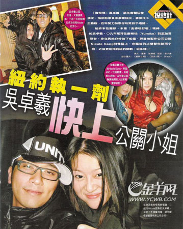 吴卓羲一向被指“花心”,昨天再次传出绯闻:有香港媒体爆料,称他在去年底和郑希怡一起到芝加哥登台演出时,与当地制作公司的公关Nicole Song闪电搭上,两人还一起到纽约参与新年倒数活动,关系亲密。