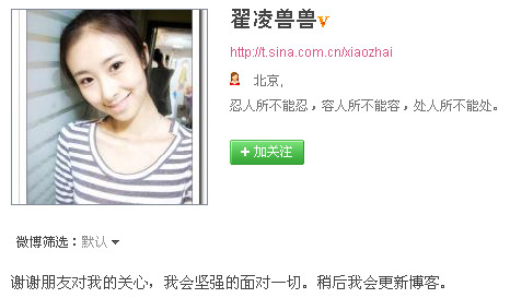 翟凌在微博中写道:“谢谢朋友对我的关心,我会坚强的面对一切。稍后我会更新博客。”