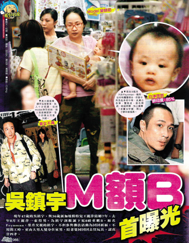 现年47岁的吴镇宇与36岁新加坡模特儿王丽萍结婚7年。去年8月,王丽萍剖腹诞下近8磅重的儿子,取名Feynman。荣升父亲的吴镇宇变身“住家男”,不用工作时都会陪妻儿去逛街。据香港媒体曝光的照片,Feynman与吴镇宇长得很像,眼大嘴小,还有相同的M字额,非常可爱。