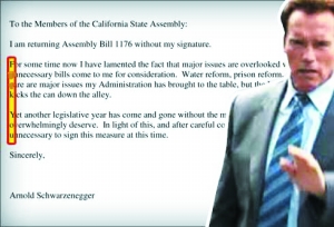 汤姆·阿米阿诺与几位议员提出了一项法案,希望加州能在旧金山地区创建基础设施融资区,采取融资计划推动这些地区的基础设施建设。通常此类法案如果不是问题太多的话,州长会予以批准。但汤姆·阿米阿诺与施瓦辛格素来看不对眼,本月初又在集会上批评施瓦辛格的施政方式,还大骂他是“骗子”。施瓦辛格否决了这项提案,并在否决信上以藏头诗的形式对阿米阿诺议员予以反击,即信件每行第一个字母连起来就是“T(Tom),I f k you,A(Arnold Schwarzenegger)”。州长办公室新闻发言人称此事纯属巧合,“试想每天写那么多否决信,这种巧合的出现是迟早的事。”