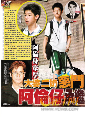 虽然现阶段阿伦极力避免让儿子曝光,但据知他眼见爱子外形讨好,又遗传了自己的歌唱天分,现已有七级钢琴的造诣,故有意带儿子入行。据唱片公司职员爆料:“阿伦整天在高层面前提起自己的儿子,说他长得帅唱歌又好。”其实,除了为儿子铺好路,身家丰厚的阿伦也在积极为爱子的生活作打算。虽然阿伦大部分财产都由发妻莎莉掌管,但真正归莎莉所有的物业只有约值3000万元,而保守估计阿伦坐拥逾5亿资产。为防他日“两房”争宠,同时也为儿子的将来着想,据知阿伦早就打算将资产转到儿子名下。“二奶”Wendy虽然现在仅有两个房子在手,但作为5亿家产继承人之母,下半世当然不用愁!(阿文)
