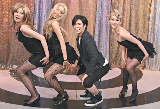萧敬腾到了《全民最大党》更是豁出去,被小野猫上身大秀M字腿,但是一见九孔模仿的“假杨谨华”又是强抱、又想压床,他还是吓得立刻弹开。萧敬腾有狂野歌声,但肢体动作不太协调,跳Super Junior的《SORRY, SORRY》时,一直踩到自己的脚。