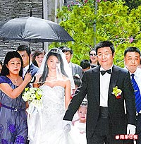 昨早9时男方以6辆奔驰车队至女方家迎娶,亲友帮新娘撑的却是黑伞,依民间习俗,一般新娘出嫁时,亲友会以米筛遮阳,如果是撑黑伞,多半意味新娘腹中有喜。问新人是否有喜时,他们只说“谢谢”,未正面回答。证婚人凤凰卫视主席刘长乐入场时,被媒体问:“小孩是男的?女的?”他也未作答。