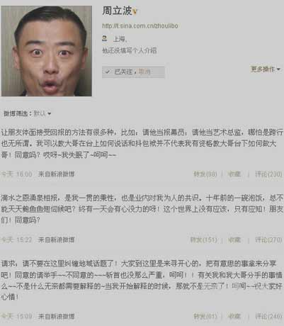 至于与经纪人周谊的分手,周立波表示:“我和她丈夫是好朋友,我放她单飞,但我还是她的基本客户。我不用经纪人了,我只用助理。谈生意没人谈得过我,我做过十几年生意了。”