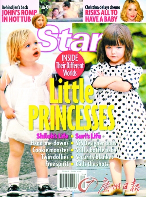 8月19日,布拉德·皮特与安吉丽娜·茱莉的女儿希洛(Shiloh)、汤姆·克鲁斯与凯蒂·赫尔姆斯的女儿苏瑞(Suri Cruise)双双登上了《Star》杂志的八月刊。在照片中,希洛仰头望天,让人忍不住想要去亲她,而苏瑞则双手在胸前交叉,一副傲慢小公主的样子,也十分可爱。
