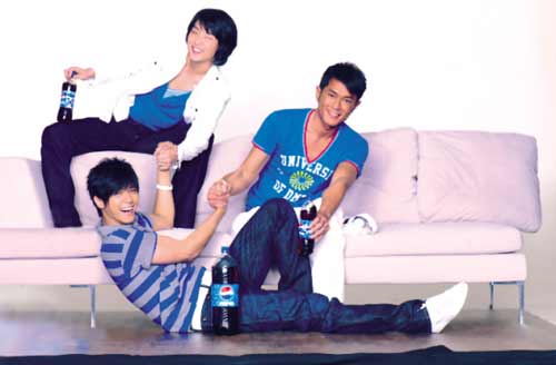 古天乐、李准基、罗志祥三人因代言百事而结缘,情深似兄弟。日前三人又聚首拍摄平面广告,三人拉拉扯扯边笑边吵被工作人员戏称“串烧三兄弟”。