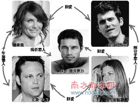 卡梅隆·迪亚兹和珍妮佛·安妮斯顿虽不是姐妹淘,但却有惊人的相似点。两人不仅都拥有金发碧眼,而且连对男友的喜好都相当相似。两人都和约翰·梅耶(JohnMayer)、保罗·斯库弗尔、文斯·沃恩(VinceVaughn)等人谱出一段恋情。(记者 张麟)