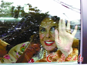 坐上车后的泰勒隔着玻璃窗向摄影师招手,她珠光宝气,依旧美艳迷人,但那已经皱纹横生的手却毫不留情地提醒着人们这位一代美女已经76岁的事实。