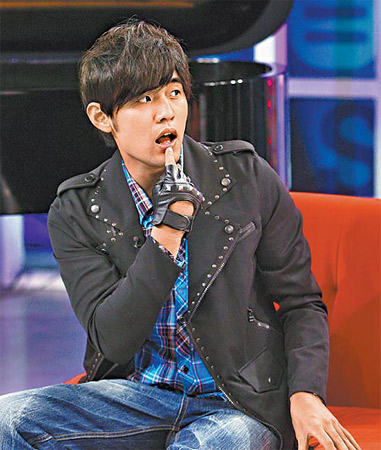 在新专辑封面化身奇幻战士的周杰伦,昨录像时露出逗趣表情。