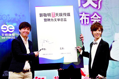昨日,郭敬明签约天娱仪式在北京举行。此次郭敬明不仅成为艺人,还成为了天娱的文学总监及创作总监。对于之前一直传出的郭敬明将出演《新流星花园》花泽类的消息,在发布会上,郭敬明予以否认。而天娱的负责人龙丹妮也表示目前还没有和郭敬明谈《新流星花园》的演出,不过郭敬明可能要在这部电视剧中客串一个小角色。