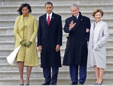 而作为离任的总统布什与劳拉的着装让人瞩目,尤其是劳拉选择素雅的浅灰色套装,非常完美的展现了她柔和、高雅的气质,而简洁的款式与剪裁让她看上去非常平和,似乎预示着她离去前平和的心态。