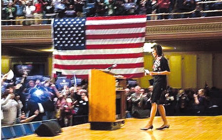 在coolspotters网站查询“米歇尔·奥巴马”,就会出现大量关于米歇尔服饰的网页,其中一个页面是在奥巴马总统就职期间,米歇尔参加一个演讲活动时的画面。画面上的米歇尔脚穿BandolinoBerry一款黑色鞋子,搭配着JCrew的套装。