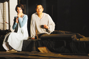 舞台上,绝对主角濮存昕忽而疯癫忽而安静,还要不停地在舞台上穿梭、奔跑、跳跃、呐喊,连观众都替他喊累。56岁的濮存昕还与30岁的高圆圆大谈“忘年恋”,时而低头密语,时而牵手狂奔,最为精彩的地方就是濮存昕将高圆圆拦腰熊抱而起。