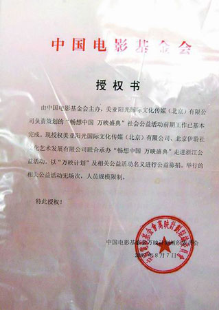 而最重要的文件、王建涛口中的“中国电影基金会授权书”原文如下:“由中国电影基金会主办,美亚阳光国际文化传媒(北京)有限公司负责策划的‘畅想中国万映盛典’社会公益活动前期工作已基本完成。现授权美亚阳光国际文化传媒(北京)有限公司、北京伊聆社文化艺术发展有限公司联合承办‘畅想中国万映盛典’走进浙江公益活动。以‘万映计划’及相关公益活动名义进行公益募捐。举行的相关公益活动无场次、人员规模限制。”这份盖着“中国电影基金会万映计划组织委员会”公章、落款日期是2007年8月7日的授权书,没有文件编号,其内容本身很难看出与本次活动的关联。
