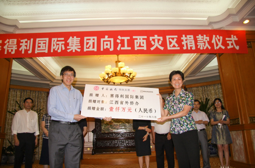在捐赠仪式上,代表陈江和先生出席捐赠仪式的赛得利国际集团首席执行官云惟生先生表示:“江西洪灾,牵动人心,新加坡金鹰国际集团及旗下企业作为中国社会的企业公民,积极履行企业社会责任,在这样的严峻考验面前,我们会尽己所能,奉献一份关爱,相信灾区人民在各级政府的领导下,必能战胜灾害,尽快度过难关,重建家园。”