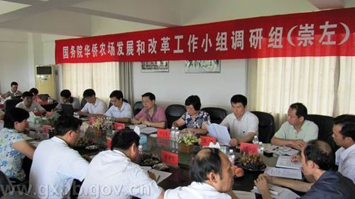 在听取工作情况汇报后,国务院调研组对崇左市华侨农林场发展和改革工作给予了充分肯定。调研组指出:崇左市侨场多,代表性强,是全国侨场改革的一面镜子。崇左侨场发展和改革工作取得了显著成绩,发展和改革工作有很好的氛围、很好的政策和很好的基础,并建议,一是要充分发挥优势,要进一步抓住机遇,乘势而上,以改革促发展;二是要进一步解放思想,更新观念,以开放促开发;三是要进一步明确责任,为侨务服务,以服务促和谐。