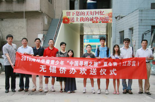 中新网7月26日电 据无锡市侨办消息,7月21日上午,江苏省无锡市侨办副主任毛小言代表无锡市侨办欢送侨港资企业家子女赴扬州参加2010海外华裔青少年“中国寻根之旅”(江苏营)活动,并与企业家及子女们合影留念。