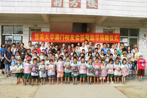 助学捐赠仪式上,黎柏强代表暨大澳门校友亲手将价值6800元的电脑交给沙园小学张校长,并将带来的文具、学习用品、玩具等一一派发给同学们。最后,全体人员与同学们一起合影留念。(小邓 黄挺)