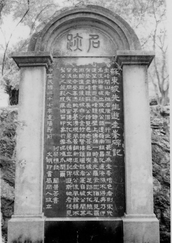此次随《苏东坡先生游圭峰碑记》拓帖被发现的还有两张相关黑白照片。一张是原碑的特写,另一张则是其在圭峰山一隅的照片。这两张照片拍于何时也已无从查察,应当是被拆毁没迹之前。从照片看,原碑属民国时代普遍出现的方形双柱半圆拱顶形制,按拓帖推算,整碑高约250CM,宽约120CM,半圆拱壁中间篆刻“名迹”二字。旁边还有一亭台供游人休憩。据年逾古稀的新会县老副县长彭陵回忆,上世纪60年代,他仍见到该碑及亭在玉台寺下。至于毁于何时却不得而知。但是作为一方证实苏东坡曾游圭峰和新会市民热心圭峰山建设史迹的石碑,弥足珍贵。所以趁着该碑拓帖和照片的发现,建议有关单位在圭峰山上选择适当地点重建和恢复原貌,为圭峰山的历史文化增加文化底蕴。