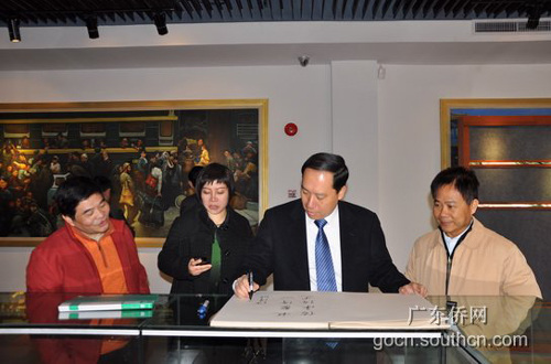 陈岸明对广东华侨博物馆在较短时间内,克服困难,征集丰富的华侨历史文物文献资料,精心筹展,完成了建设和布展任务表示祝贺,表示湛江将加强与广东华侨博物馆合作,挖掘利用湛江丰富的华侨历史文化,并写下“传承侨史,凝聚侨心”观后感言。(叶欣)