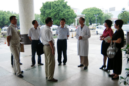 此次上海市侨办调研组来到开平的第一站是开平市中心医院。该医院是开平市目前最大的捐赠项目,是由祖籍开平赤水镇的旅港侨胞香港著名金融家利国伟捐资5千万元人民币兴建的大型医疗卫生项目。调研组在卫生局副局长邝家俊先生的讲解下,了解医院的设备配置、医务人员构成等情况。