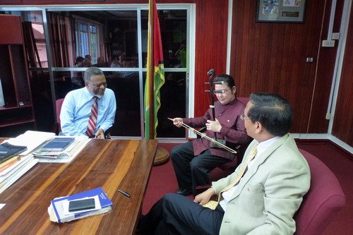 双方互赠了礼品。席间,重庆市歌剧院院长、国家一级演奏家刘光宇为圭亚那总理萨缪尔·海因兹即兴演奏了二胡独奏《赛马》、《月亮代表我的心》。