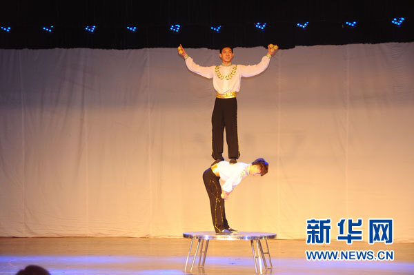 2014“文化中国•四海同春”欧洲艺术团20日在京进行带妆彩排。图为杂技《双人球技》。 新华网 朱永磊 摄
