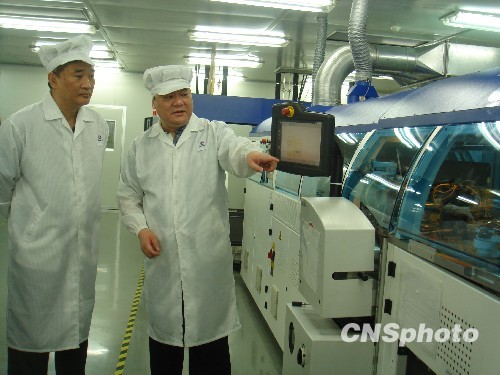9月7日,由国务院侨办、全国政协港澳台侨委员会、致公党中央、中国侨联组成的维护侨商投资权益联合调研组,考察了桂林鸿瑞科技发展有限公司,桂林西麦生物技术开发有限公司和桂林留学人员创业园等几家侨资企业。图为中国侨联副主席李祖沛(左)参观桂林鸿瑞科技发展有限公司的光盘生产车间。 中新社发 欧惠兰 摄