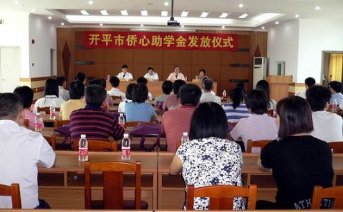 中新网9月18日电 9月17日,广东省开平市侨联举行侨心助学金发放仪式,开平市旅港实业家、开平市和江门市荣誉市民周志峰专程回乡向该市55位家庭经济贫困的大学生和高中生发放侨心助学金3.77万元。开平市副市长苏树栋、开平市关心下一代工作委员会主任苏清香,以及开平市外侨局、开平市侨联领导参加侨心助学金发放仪式。