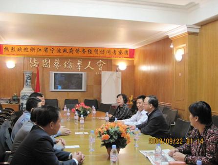 在法国期间,访问团拜访了法国华侨华人会。现任主席陈胜武及副主席张过祥、陈其跃等负责人,热情接待了访问团,相互进行了座谈;访问团还参观了位于巴黎市中心四区的会所、文化中心,及中华文化学校。通过座谈参观,访问团了解到,近年来,随着中国国力迅速增长,旅法华人地位不断提高,华人也在改变过去不关心政治的惯例,正在努力融入当地主流社会。访问团与法国华侨华人会互赠了礼品;法国欧华历史学会会长叶星球还向访问团赠送了其撰写的《法国华人三百年》一书。