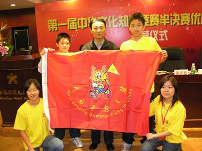 中新网10月13日电 10月11日,第一届中华文化知识竞赛半决赛优胜者冬令营在成都开营。四川省侨办副主任吴振西(中)出席、致辞,并向营员代表授旗。四川省侨办领导还与全体营员合影留念。(四川侨办 赵林)