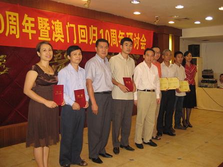 10月14日下午,广东省江门市侨联、江门市华侨历史学会在市侨联大厦举行以“庆祝建国60周年暨澳门回归10周年”为主题的研讨会。江门市政府副市长谢日荣,市外事侨务局局长、侨联主席张国富,市社科联主席杨伟雄,澳门大学中国文化研究中心主任郑德华教授等专家学者以及学会理事等50多人出席。研讨会由江门市侨联专职副主席林春晖主持。