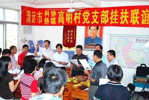 清远市科协、市侨联根据安排,今年开始与高明村结对帮扶,除帮助村发展集体经济外,个人结对帮扶18户贫困户。两个单位的干部上半年已经一一走访了每个结对帮扶的贫困家庭,并根据帮扶家庭的实情制定了不同的脱贫方案。两单位在帮扶的时候特别注重智力扶贫与劳力输出扶贫。今年高明村有5位高三学生考上了大学,其中,1名考上广州大学,2名考上广东技术师范学院,2名考进韶关学院。考上广州大学的学生叫邓毅,去年他考上了深圳一所学院,但因家庭贫困,该学院学费生活费又较高,家里无钱而被迫弃读。今年再次高考,他选择了学费较低的广州大学。9月开学后,邓毅尽管省吃俭用,仍面临断粮的局面。市科协与侨联获悉情况后,为他及时送上了3000元助学金,并同时资助其他4名大学生。今年下半年,市科协与侨联通过联系深圳的企业,积极推荐高明村的青年到收入较高的企业务工,最近已经专车送了6位高中(中职)生到深圳手机厂工作,月薪2500元。