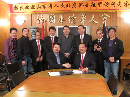 双方一致同意,今后进一步加强信息交流,互相支持,开展实质性合作。山东省海外交流协会副会长史进与华侨华人会会长陈胜武在友好关系协议书上签字。