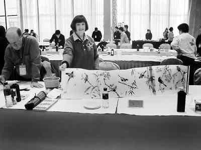 国际友人对笔会也是情有独钟。来自澳大利亚的博理查和宣月,已跟中国老师林伯墀学中国画达10年之久。林老师让宣月不但学中国画,还要学更多的中国文化。她这次来想通过参与交流,开阔视野,取长补短,使自己的绘画艺术再上一层楼。她还高兴地展示了自创的花鸟画集,并和博理查向艺术节敬献了现场创作的“鲜花绽放图”和“袋鼠翘首观望图”。来自美国西雅图的画家,把自己创作的一幅长达十几米、影响类似中国《清明上河图》的《西雅图美景》大画赠给了华人文化艺术节组委会,感动了在场的海内外侨胞。