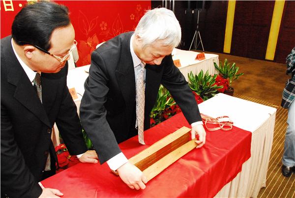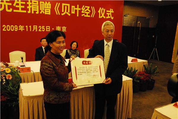 中新网11月26日电 据江苏侨网消息,11月25日,全国政协委员、香港汉荣书局董事长总经理石汉基在南京向江苏省五所著名寺庙捐赠了珍贵文物《贝叶经》。国务院侨办副主任马儒沛、江苏省政协副主席,省委统战部部长周珉,省侨办主任韩建民等领导出席捐赠仪式并在捐赠仪式前会见了石汉基一行。