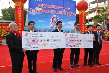 庆典现场上,邝文炽先生以97岁的高龄,真情诉说着红蓝儿女与培正的绵绵情意,在展望台山培正学校美好未来时,邝老当即现场捐出人民币100万元,这一义举引来一片喝彩,也让在场人士无不为之动容。在他的带动下,培正校友陈国强先生也现场捐资100万元,为台山培正的发展再添力量。