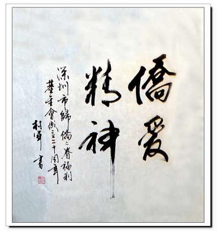 根据年初深圳市侨联常委会的会议精神及市归侨侨眷福利基金会的工作计划,基金会将举办市归侨侨眷福利基金会20周年纪念活动,以对所有支持关心过基金会的领导和社会知名人士表示感谢,并出一本基金会纪念册,以纪念基金会成立以来的风雨历程。当参加广东省第九次侨代会的广东省侨联常委、深圳市归侨侨眷福利基金会副理事长刘伟良邀请林军为市归侨侨眷福利基金会题词时,林军欣然应允,当即挥笔疾书“侨爱精神”,为市归侨侨眷福利基金会成立20 周年献礼。