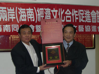 台北市海南同乡会理事长符子正亲自会见并组织和主持了迎接访问团一行的座谈会,宾主双方互赠礼品。
