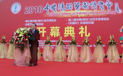 中新网1月6日电 据广东侨联网消息,近日,2010中国(陈村)艺术博览会开幕式在广东省佛山市顺德陈村花卉世界隆重举行。应博览会组委会邀请,广东省侨联和瓦趣轩联合在博览会上举办了珍瓷回归展。广东省侨联副主席区德强和瓦趣轩主人、广东省侨联顾问黄金源先生以及来自省内外的收藏艺术爱好者200余人参加了展览。