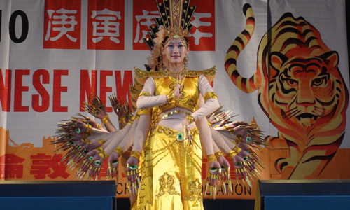 中新网2月22日电 国务院侨办“文化中国•四海同春”艺术团在伦敦特拉法加广场演出舞蹈“千手观音”。