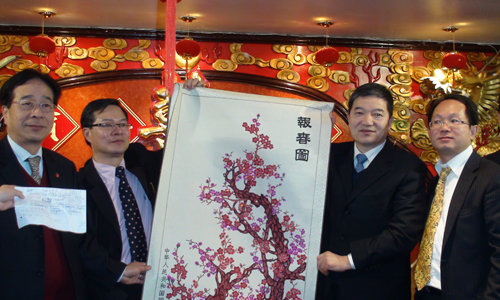 国务院侨办副主任任启亮代表国务院侨办“文化中国•四海同春”艺术团向伦敦侨界代表赠送纪念品
