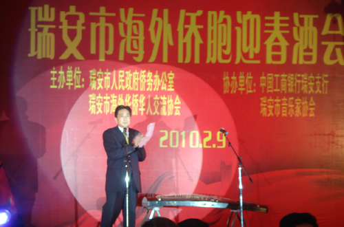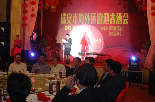 温州市侨办主任陈永聪和瑞安市四套班子领导以及涉侨部门负责人出席了酒会。酒会的协办单位瑞安市工商银行和瑞安市音乐家协会为酒会准备了精彩的文艺节目,增添了喜庆的气氛。(卓阳)