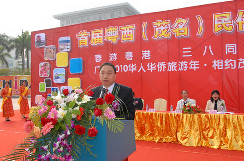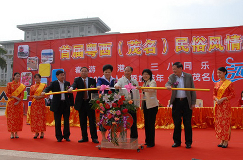 中新网2月24日电 据茂名外侨局消息,2月23日,广东省茂名市在市文化广场隆重举行首届粤西(茂名)民俗风情旅游节,同时启动“春游粤港·三八同乐”和“广东2010年华人华侨旅游年·相约茂名”活动。茂名市人大常委会常务副主任宋寿金,广东省侨办副主任林琳,广东省旅游局副局长王志红,茂名市市委常委、副市长林日娣,市政协副主席章宁,茂名市外事侨务局局长梁红健及美国茂名同乡会会长郭严芳先生等领导和各界来宾约600人出席了活动。