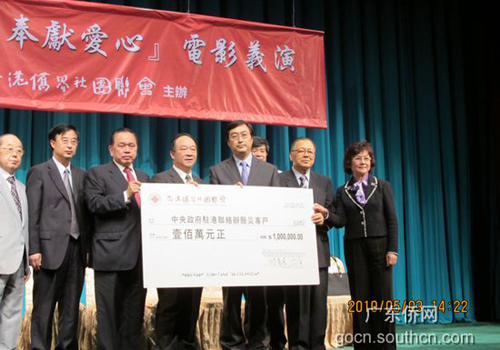 中新网5月6日电 据广东侨网消息,5月3日,香港侨界社团联会举行“情系玉树 奉献爱心 电影义演”暨向玉树地震灾区捐款仪式,广东省侨办主任吴锐成应邀出席并讲话。