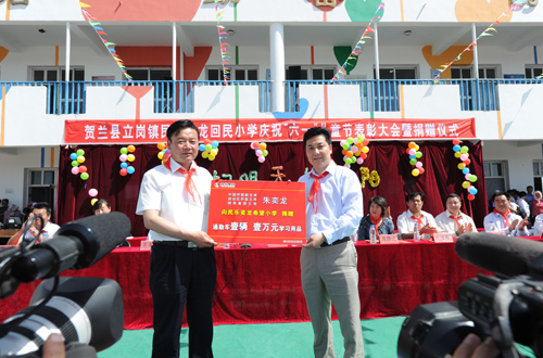 朱奕龙深情地说:和老师同学们一样,每一个“六一”,既是你们最快乐的节日,也是我最高兴、最幸福的日子。因为10年前,从银帝集团成立那天起,我就给自己定下了一个目标——每年捐建2所希望小学。如今,10年过去了,我很荣幸并很负责任地向大家报告,已经有60多所奕龙希望小学扎根全国、全区各地,我相信不久的将来,还有更多的希望小学矗立在宁夏山川。2003年,我在黄河岸边捐建了民乐奕龙小学,吸引了社会上更多关注教育、关注孩子们的眼光,更多的教育资金投向了这里。同时,看到一批批学生从这里走进了更高的学府,我是多么的高兴啊!2008年政治局委员、国务委员刘延东在教育部部长周济、自治区党委书记陈建国、自治区人民政府主席王正伟等领导视察了民乐奕龙侨心希望小学,对我也是极大的鼓舞。听说今年4月,民乐奕龙在“宁夏希望工程20年”典型表彰活动中,又连获“模范希望小学”、“希望工程优秀教师”、“希望之星”三项提名奖,我为广大老师和学校取得的荣誉感到非常的高兴,为你们取得的成绩感到无比的骄傲和自豪。今天看着学校优良的设施建设,优美的教学环境,我深感欣慰,更为默默无闻、辛勤工作、无私奉献的教师们感到敬佩。你们长期为了教育事业工作在乡村,对艰苦的生活环境和生活状况无怨无悔,令我非常感动。