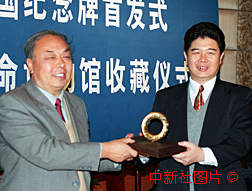 由香港著名设计师宣小英设计的"澳门回归纪念牌",三日在北京由发行单位中国安徽国际经济技术合作公司将"0001"号捐献给中国革命博物馆作永久收藏。