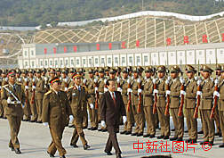 解放军驻澳门部队19日公开亮相,国务院副总理、澳门特别行政区筹委会主任委员钱其琛在广州军区司令员陶伯钧和驻澳部队司令员刘粤军陪同下,在驻澳部队珠海基地检阅驻澳门部队仪仗队。
