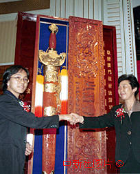 为庆祝澳门回归祖国,河南省旅游局与登封市民政府将一柄制作精良、重五十斤的特大型少林宝剑赠送给澳门人民。图为河南省旅游局副局长方洪莲(右)向澳门政府旅游司代司长文绮华赠送宝剑。